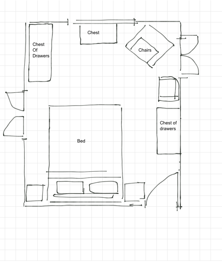 I’ve been browsing Pinterest to help plan my dream spaces. It’s like working with mood boards and magazines except online. Totally addictive. I’ve found lots of interiors I love, particularly kitchens and laundries and bathrooms (because none of ours are any good), but rather fewer master bedrooms. Perhaps that’s because I have such a strong design sense for this space already. Our bedroom is perilously close to being “perfect” in my eyes. The room is a reasonable 3.6 metres by 4.2 metres, and we have a large “sunroom” to the left which we use as a sitting room when the children aren’t here. We don’t have a WIR or ensuite yet. That is a sad, sad story for another day.