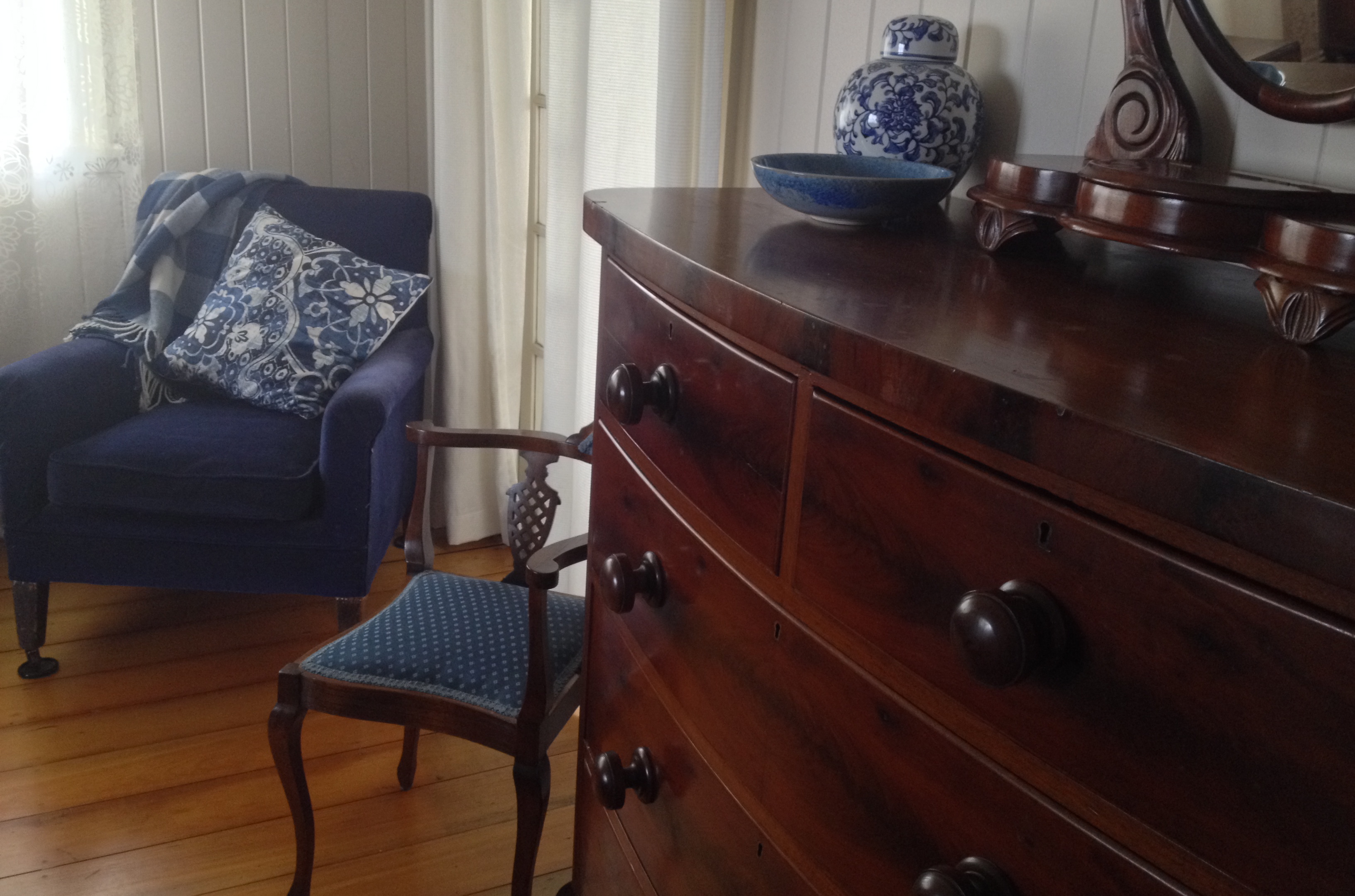 The nude drawing above the bed I bought from an artist friend, and I’ve started collecting blue and white Chinese-style pots to put on the mahogany chest of drawers because they look lovely against dark wood. I’d like to create a gallery wall but DH is a little bit overwhelmed by home clutter at times so I might have to leave the gallery wall for the powder room (aka the dunny). We have a suitable wall space next to my side of the bed, but given the amount of stuff in the room already I think DH would go crazy! Plus my side of the bed is a bit squeezy. I might have trouble getting past the hangings.