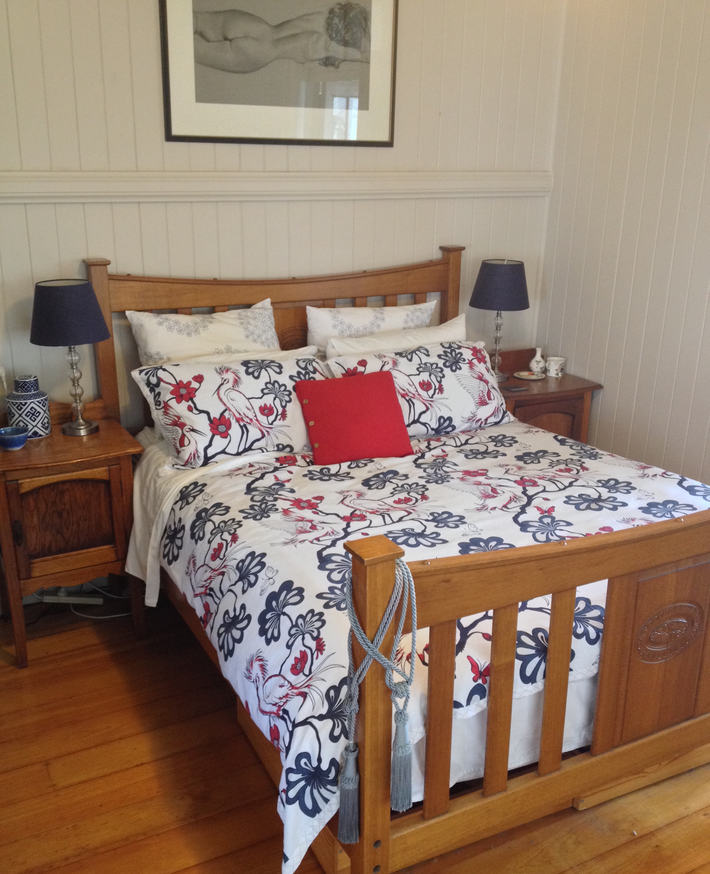 The walls are a peaceful sand with white ceilings and our bed linen is Florence Broadhurst Egrets in a striking blue and red pattern which both DH and I loved on first sight: