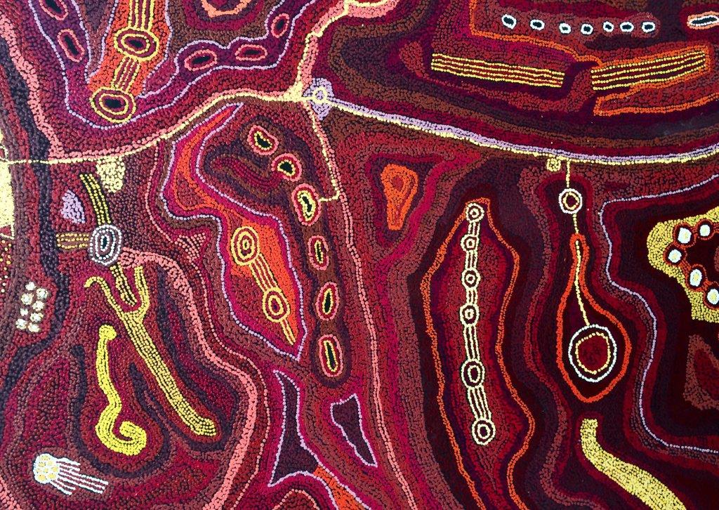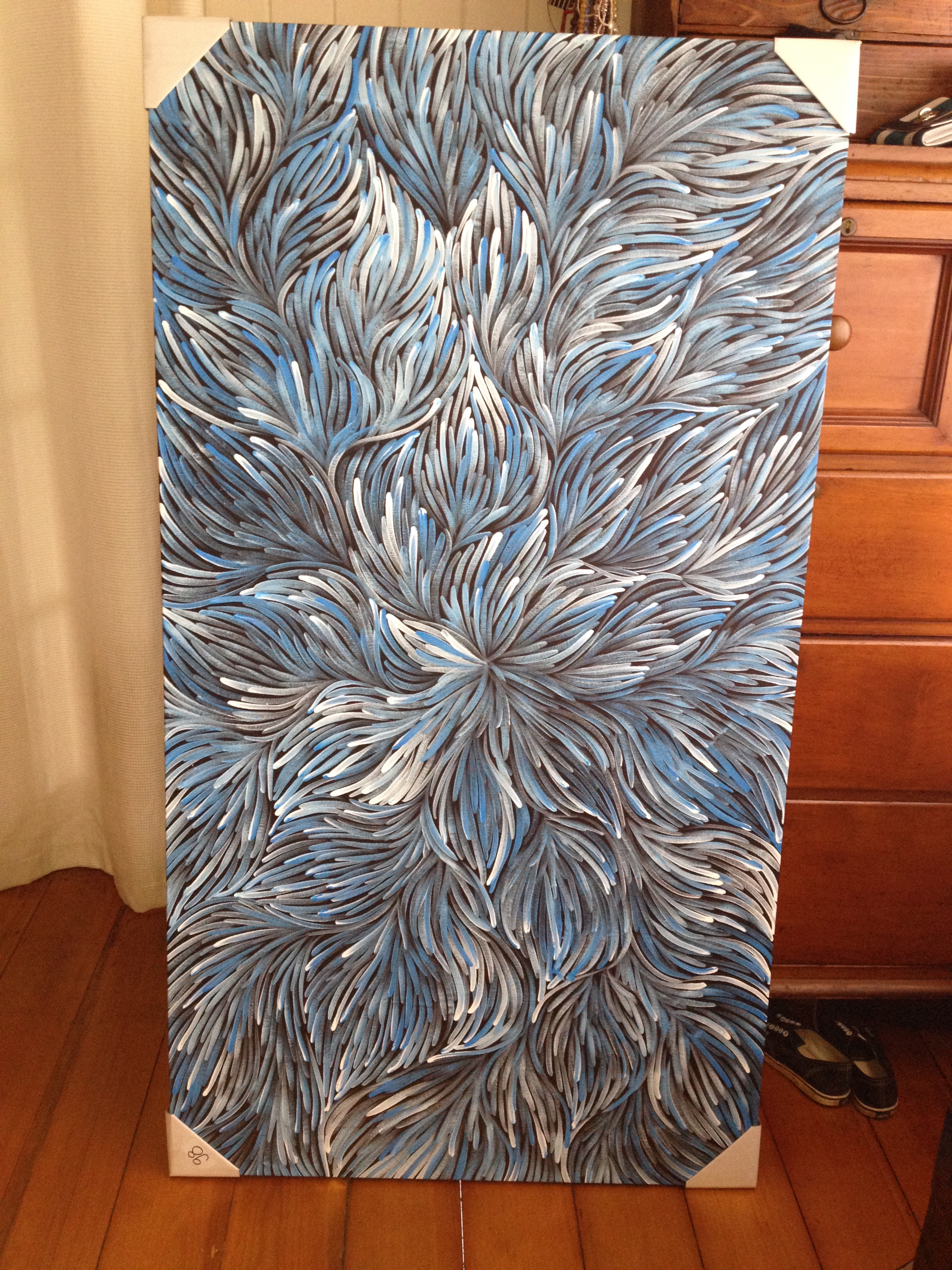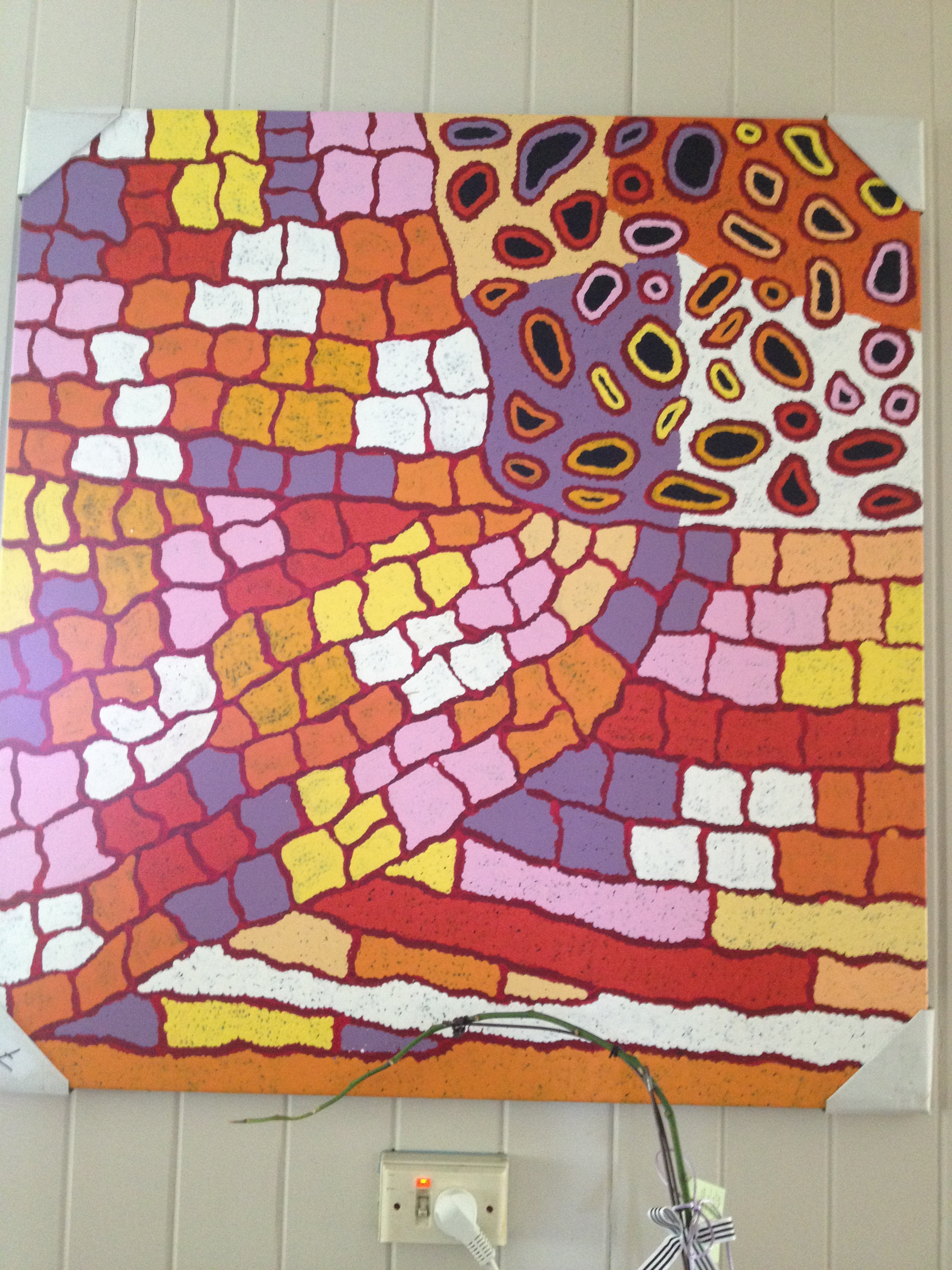 So here are our lovely new paintings. Not expensive, but I rather like the cheerful red and orange one called My Country by Nellie Marks Nakamarra. Every time I go into the kitchen there it is, all bright and present. It’s delicious and a great blast of cheer in that rather dark room. I’m not sure about the Patricia Kamara Bush Medicine blue one. We’ve bought it for DH’s office but I’m not sure it will work there, and it’s quite strong in our blue-themed bedroom. Nevertheless, it will look great over the bed if it doesn’t suit the office. The great thing about buying art is that if you don’t like it or it doesn’t suit purpose you can sell it again. Huzzah!
