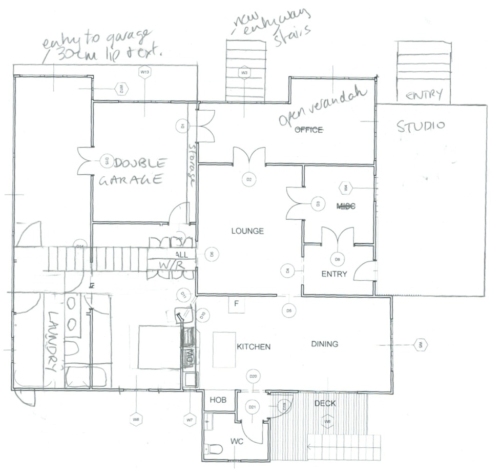Here are some plans I’ve recently played with. The first highlights upstairs and the second downstairs. DH and I desperately want a back deck and extension to our home as we currently have nothing there. I also want a separate studio (with toilet) for my students. The next thing is garage, extra bedroom and bathroom and laundry. And as I mentioned in a previous post, our garden is an interesting jungle design at present and I want to create a back yard oasis – but not until the builders have finished with it first. As our house sits on an 810sqm block, we really don’t have too many limits in the first 20 metres – it’s only the back half of the block that easements are our pest. Our designer talked about going downstairs which works for us, but as we also want to extend the back, it makes sense to me to discuss and plan the next phase before launching headlong into the first phase. But we also need to finalise plans for the front so that when we go to council it’s all there ready to go.