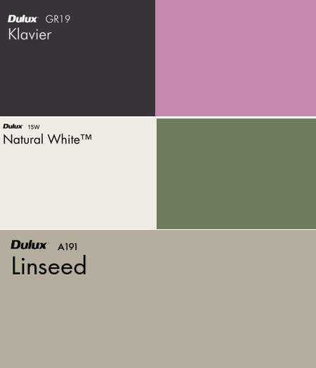We don’t really have the funds to paint the entire exterior – I got a quote that was nearly $30,000!!! So we’re taking the much cheaper option of painting the trim, fence, rails, bannisters and decking posts a bright Dulux Natural White. This has a cream base but is much brighter than the current colour, which is a deep cream. And we’re looking at a lovely mid green called Taubmans Sweet Clover for the contrast colour, which we will use sparingly on the window trims. We’re playing with a strong black/brown Dulux Klavier for the decking boards – everything is a dreary, miserable dark green at the moment, so this will provide a much needed lift. At some point we will need to replace the boards but not this decade – when we do we’ll go with a natural timber colour. Silver paint will be used for all the window hoods – we could replace them but the metal is solid, so painting over them is better, IMHO. And finally, of course, we will be painting the front door a divine Taubman Sachet Pink to match its glass insert.