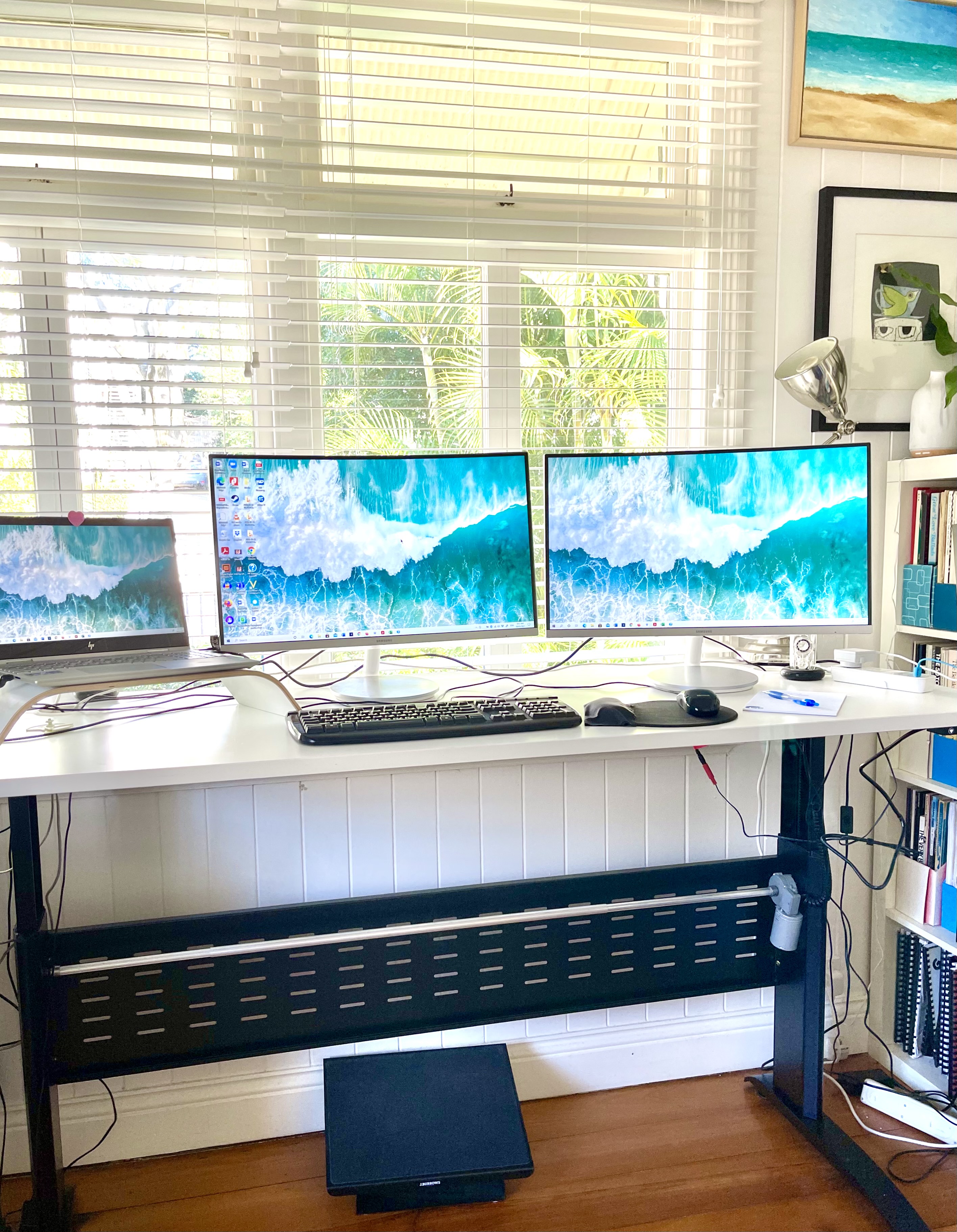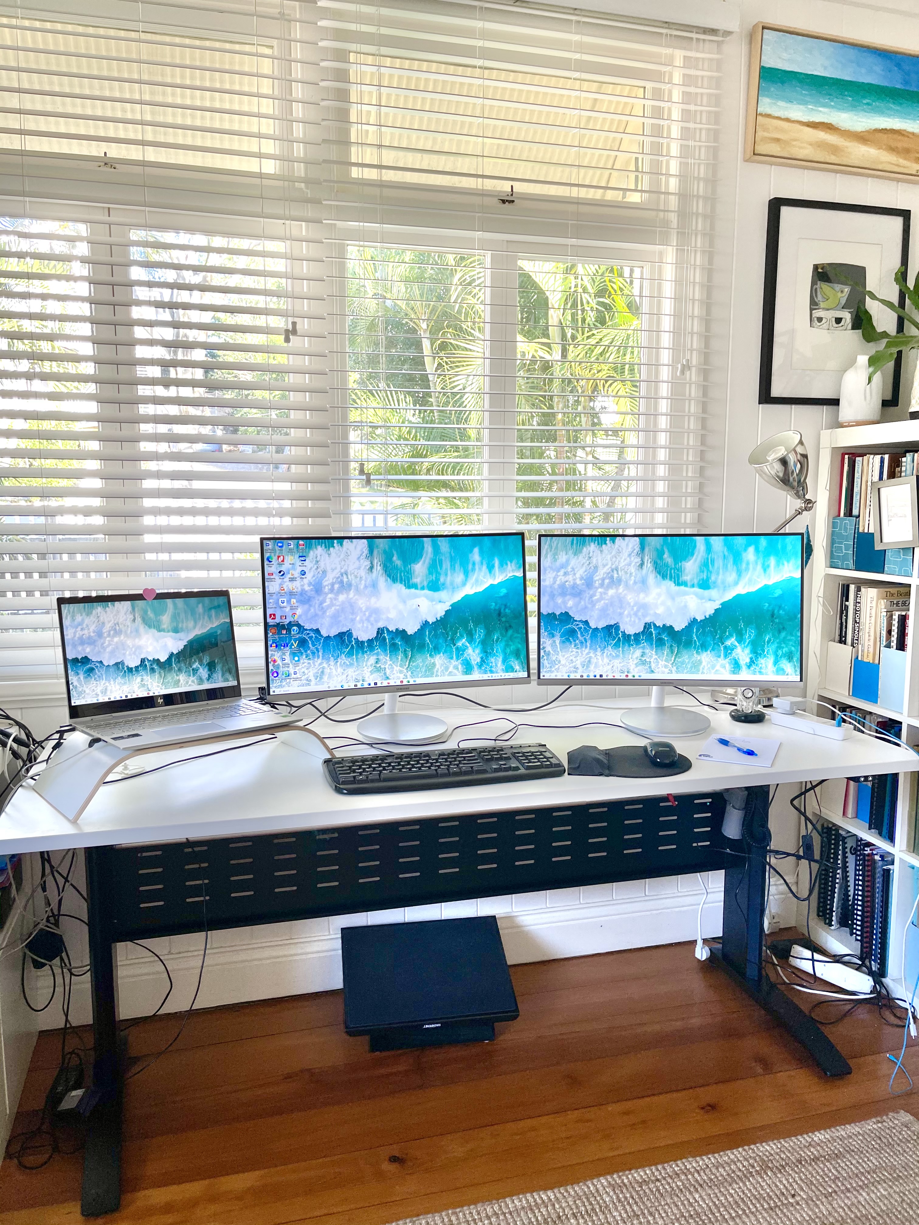 So I bought a large black and white standing desk and assembled it myself with 2 screwdrivers and a drill (the instructions did NOT recommend this as a thing – I had to find out when there were no pre-drilled holes in the desk top). And I love it. I stand most of the day now, and if I get a little tired I walk away and come back to it in the standing position. It’s fantastic. This desk is very large because I have three screens (2 monitors and a laptop, plus assorted portables when needed), and I needed to ensure the desk wouldn’t sag over time, as they tend to do when made of veneer and chipboard. The Rapid Span 1800mm desk (made in China) came with a modesty panel as standard – this helps to stabilise the desk in the standing position – and a metal u-beam that screws to the underside of the desk. Even better is that I can see outside to my garden now, and I love it!